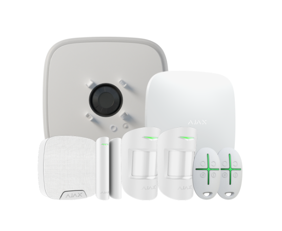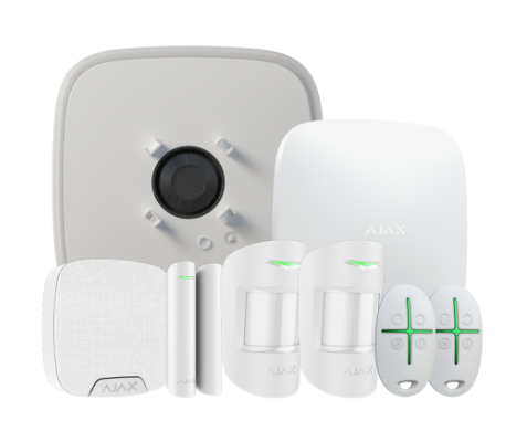 The Kit 20 features Ajax Hub 2 (supports all AJAX devices including standard motion protect PIRs + 32 Scenarios), 2x MotionProtect S, 1 x DoorProtect S, 2x Space controls, StreetSiren DD S and HomeSiren S.