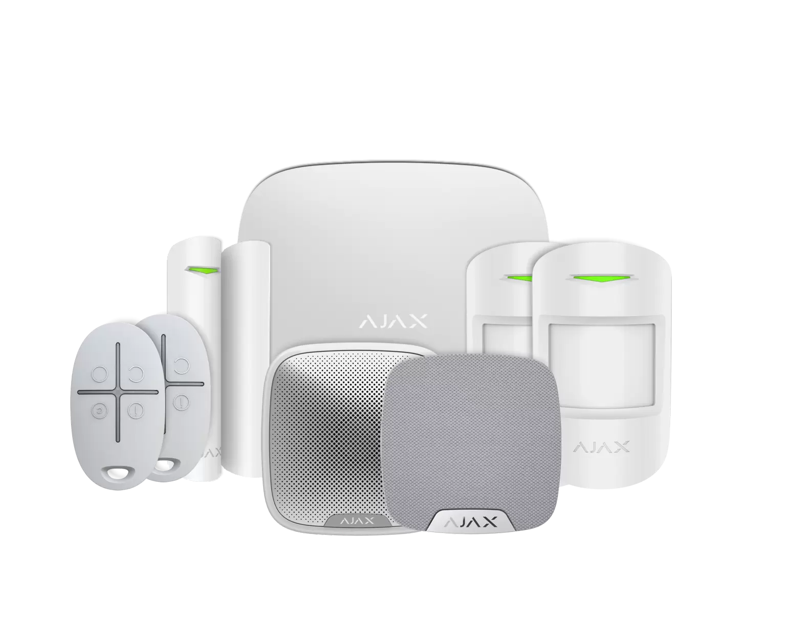 The Kit 2 features Ajax Hub 2 (supports all AJAX devices including standard motion protect PIRs + 32 Scenarios), 2x MotionProtect S, 1 x DoorProtect S, 2x Space controls, StreetSiren and HomeSiren S.