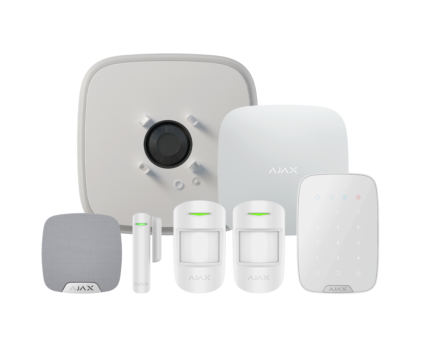 The Kit 21s features Ajax Hub 2 (supports all AJAX devices including standard motion protect PIRs + 32 Scenarios), 2x MotionProtect S, 1 x DoorProtect S, 1x Keypad Plus S, StreetSiren DoubleDeck S and HomeSiren S.
