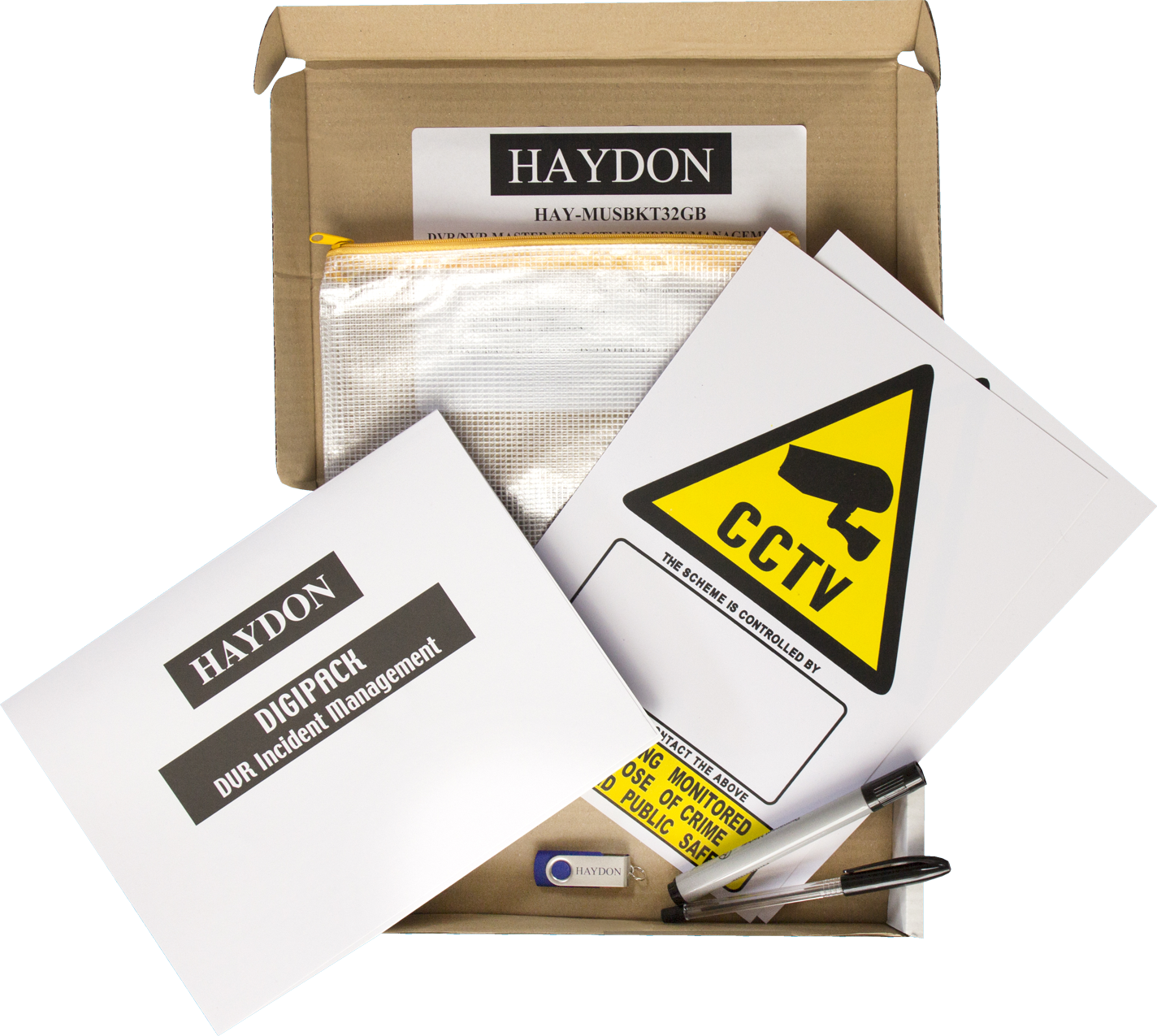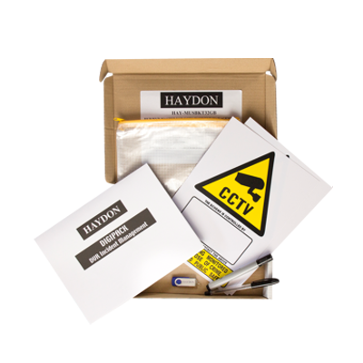 This kit provides the user with 25 incident report logs for CCTV evidence. The 32GB MASTER drive is to be kept on site and used for the users own backup of any incident until the authorities have finished with the evidence. If anything happens to the original evidence given to the authorities you have a backup as the DVR/NVR will usually have written over the evidence. After any case is finished then the incident on the Master drive must be deleted. 2 X Data Protection compliant CCTV A4 warning signs where you write the operators name & contact details with the permanent marker provided. This pack is designed to be used with HAY-5USB16GBPK which are the drives and evidence bags for incident downloads to be used by the authorities.