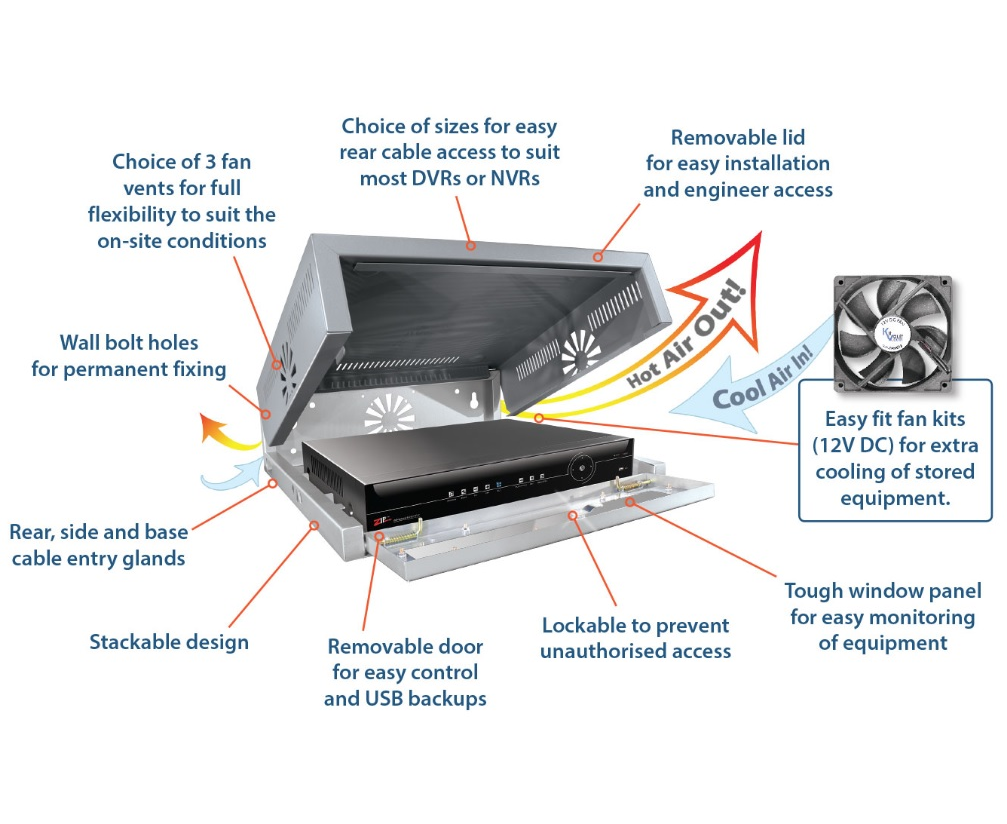 Great for Medium sized DVRs/NVRs of 8-16 channels but with enough space surrounding it to allow for the addition of up to 3 cooling fans to keep your CCTV equipment cool, especially handy in enclosed spaces.