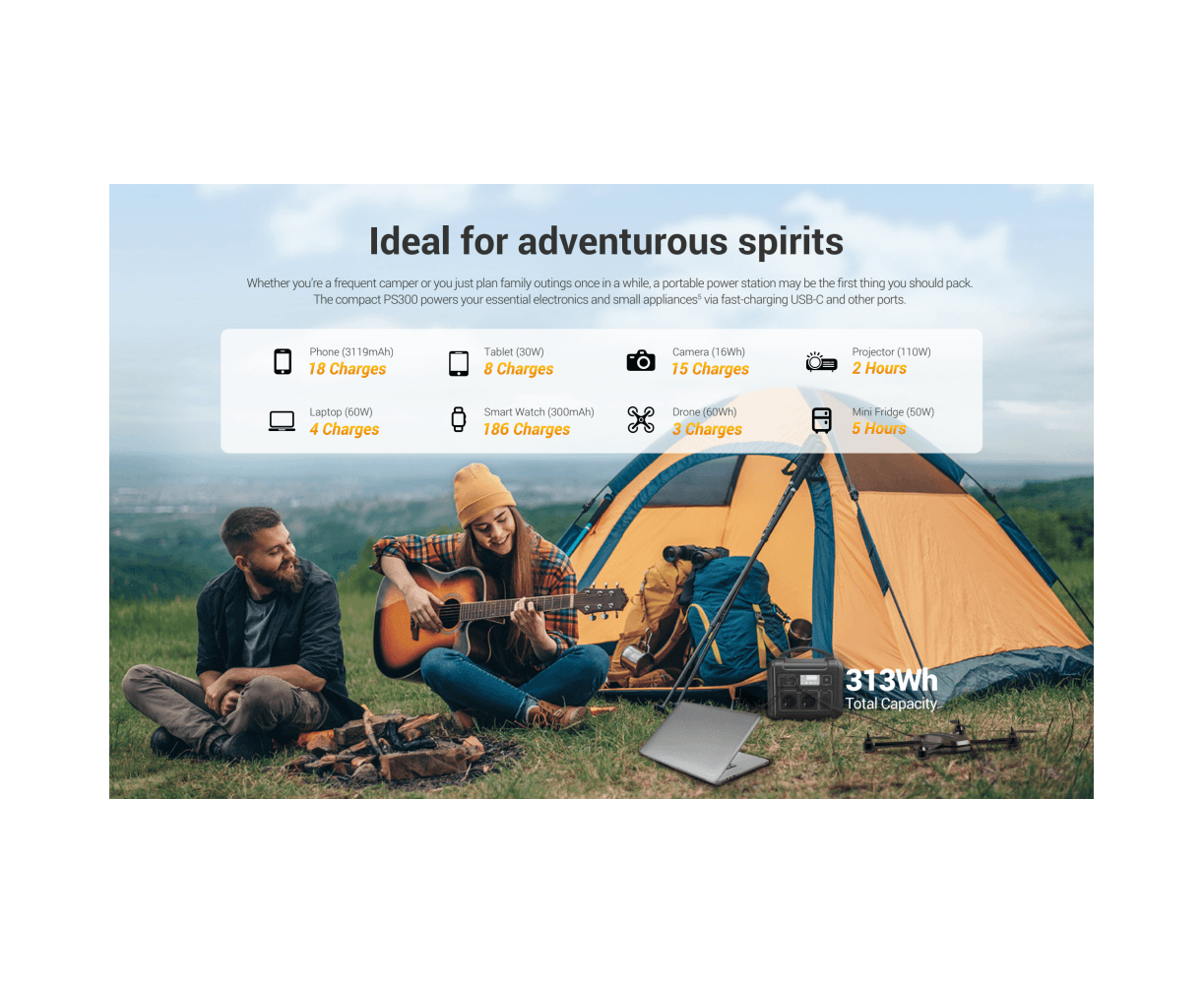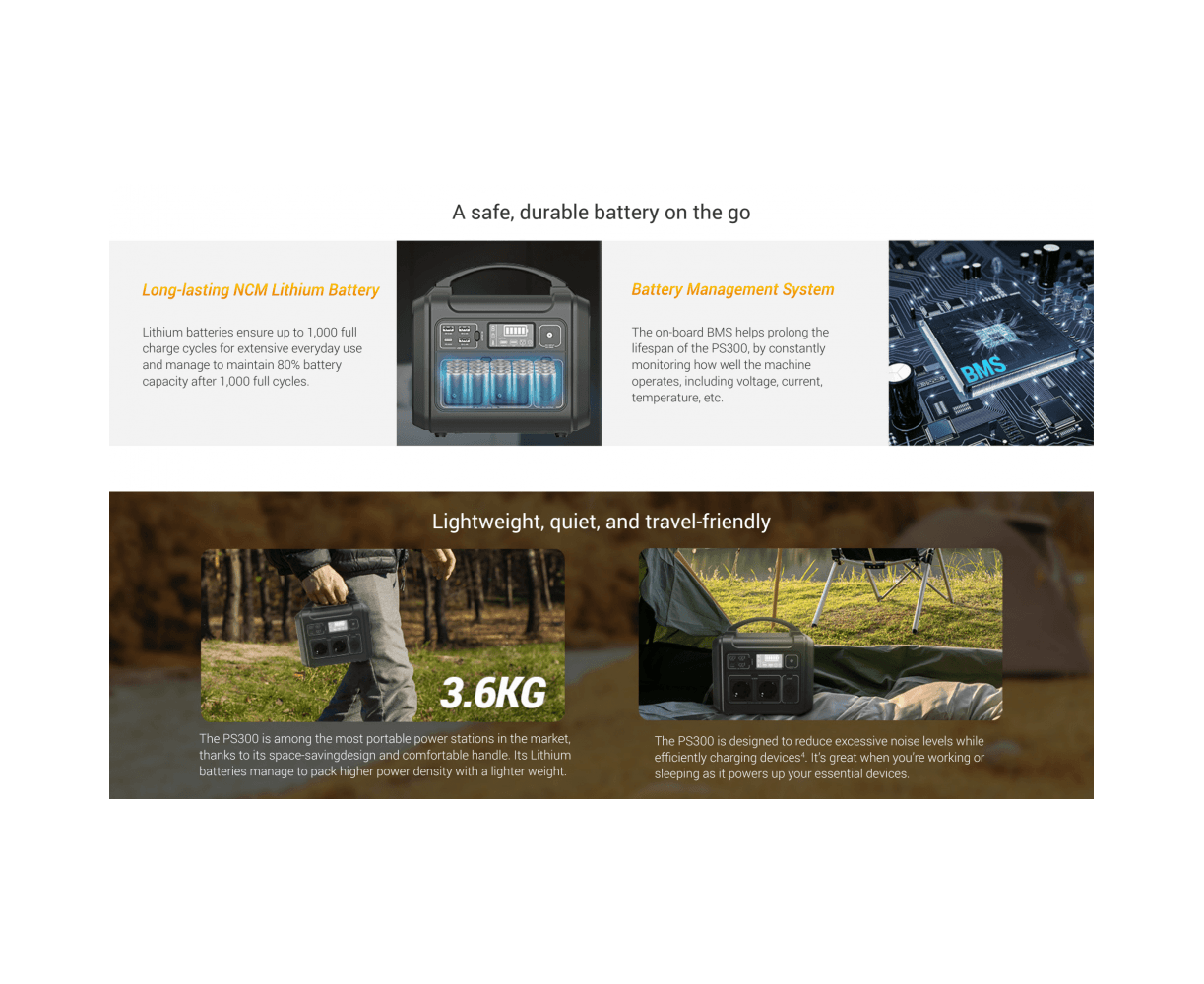 - Noise Reduction Technology: Enjoy efficient charging of your devices without the hassle of excessive noise levels. The PS300 is designed to reduce noise levels while efficiently charging your devices.