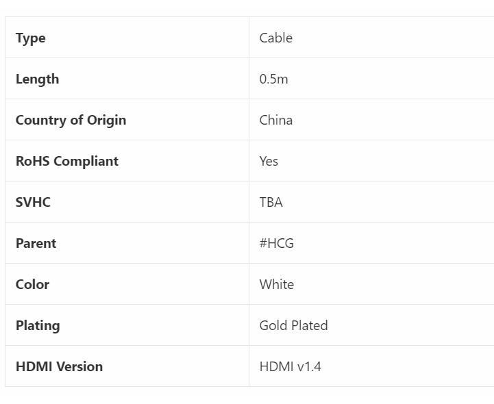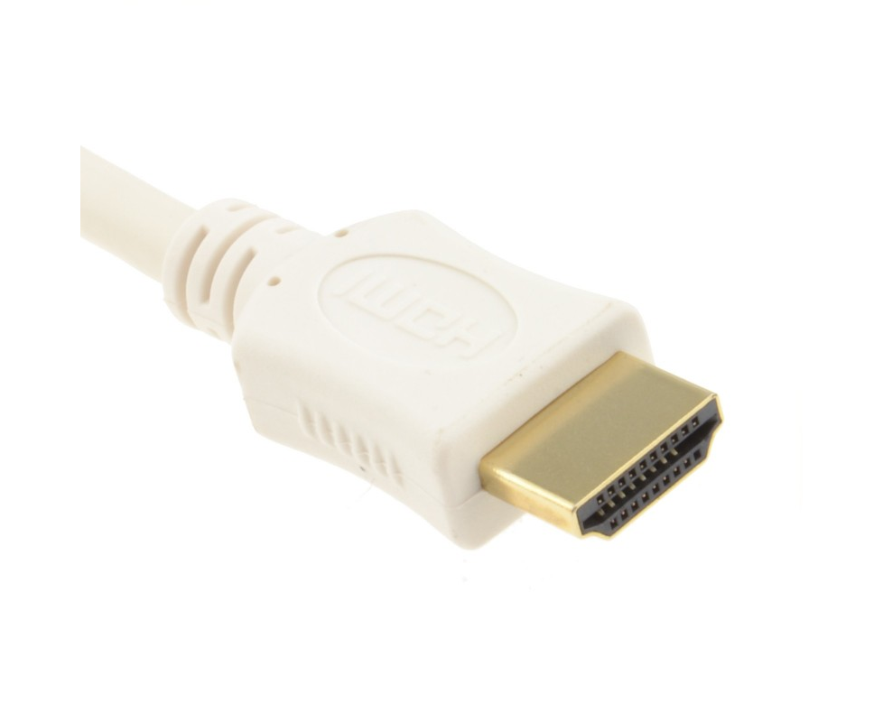 HDMI v1.4 Supports 3D over HDMI Supports 4K x 2K Resolution Audio return channel HDMI Ethernet channel Gold flashed contacts White PVC jacket and hoods HDMI link allowing users to take full advantage of their IP-enabled devices without a separate Ethernet cable. Audio Return Channel (ARC) - Allows an HDMI-connected TV with a built-in tuner to send audio data upstream to a surround audio system eliminating the need for a separate audio cable. 3D - Defines input/output protocols for major 3D video formats paving the way for true 3D gaming and 3D home theater applications. 4K Support - Enables video resolutions far beyond 1080p supporting next-generation displays that will rival the Digital Cinema systems used in many commercial movie theatres. Content Type - Real-time signaling of content types between display and source devices enabling a TV to optimize picture settings based on content type Additional Color Spaces - Adds support for additional colour models used in digital photography and computer graphics.