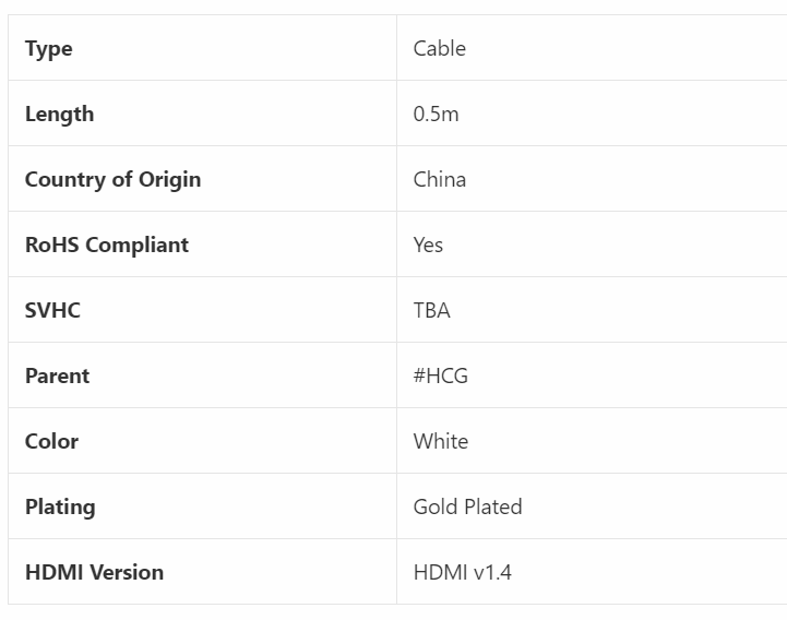 HDMI v1.4 Supports 3D over HDMI Supports 4K x 2K Resolution Audio return channel HDMI Ethernet channel Gold flashed contacts White PVC jacket and hoods HDMI link allowing users to take full advantage of their IP-enabled devices without a separate Ethernet cable. Audio Return Channel (ARC) - Allows an HDMI-connected TV with a built-in tuner to send audio data upstream to a surround audio system eliminating the need for a separate audio cable. 3D - Defines input/output protocols for major 3D video formats paving the way for true 3D gaming and 3D home theater applications. 4K Support - Enables video resolutions far beyond 1080p supporting next-generation displays that will rival the Digital Cinema systems used in many commercial movie theatres. Content Type - Real-time signaling of content types between display and source devices enabling a TV to optimize picture settings based on content type Additional Color Spaces - Adds support for additional colour models used in digital photography and computer graphics.