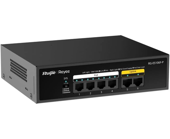 The Ruijie RG-ES106F-P is a compact 6-port Fast Ethernet unmanaged switch designed for small networks that require simple installation with Power over Ethernet (PoE). Featuring 4 PoE-enabled ports, this switch provides both data and power to compatible devices such as IP cameras, access points, and VoIP phones—making it ideal for plug-and-play deployments.