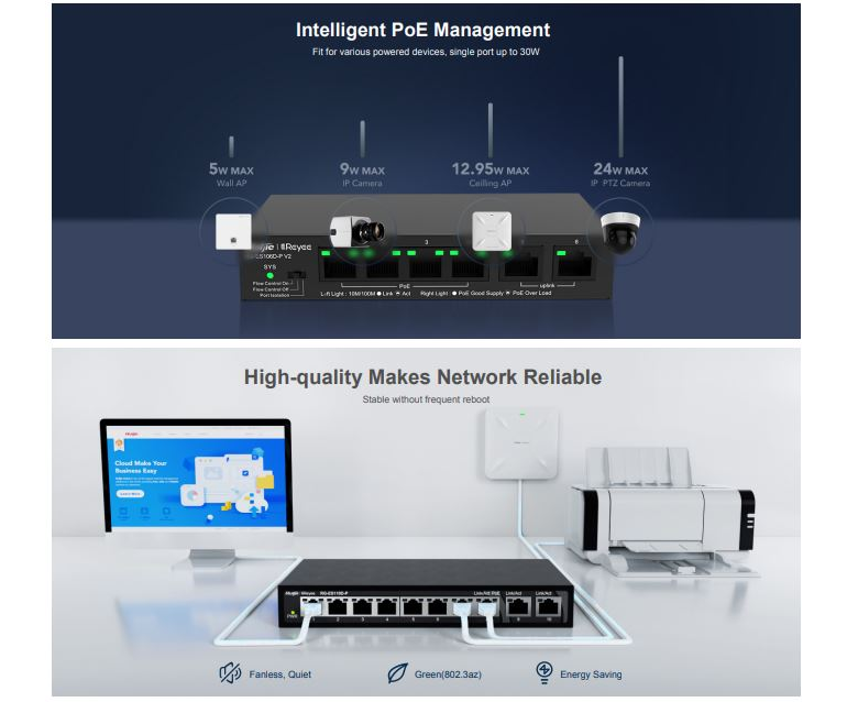 Video surveillance has been widely popularized, and more and higher requirements are raised for surveillance security switches that are indispensable for video data transmission. Ruijie-Reyee launches the RG-ES100 Series of Unmanaged Switches to provide customers with next-generation unmanaged surveillance security switches that feature diversified specifications, stable quality, and high-cost performance. The RG-ES100 Series supports diversified product forms like desktop or rack-mounting installation and 6 to 26 port PoE/non-PoE switches helping customers cope with the stringent requirements of different projects.