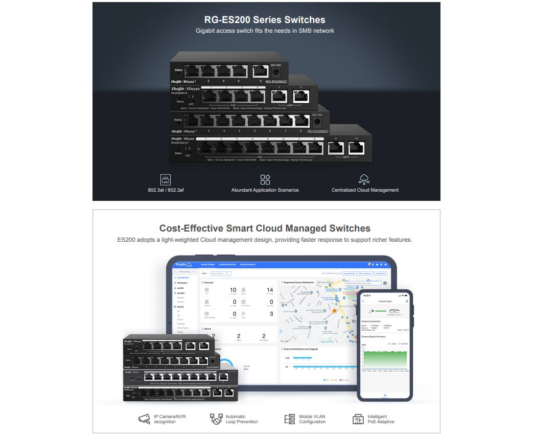 Ruijie RG-ES209GC-P, a switch for your cameras. It offers a variety of port options to meet the needs of video surveillance networks of different scales. With NVR camera recognitions, excellent troubleshooting to cover all your surveillance needs.