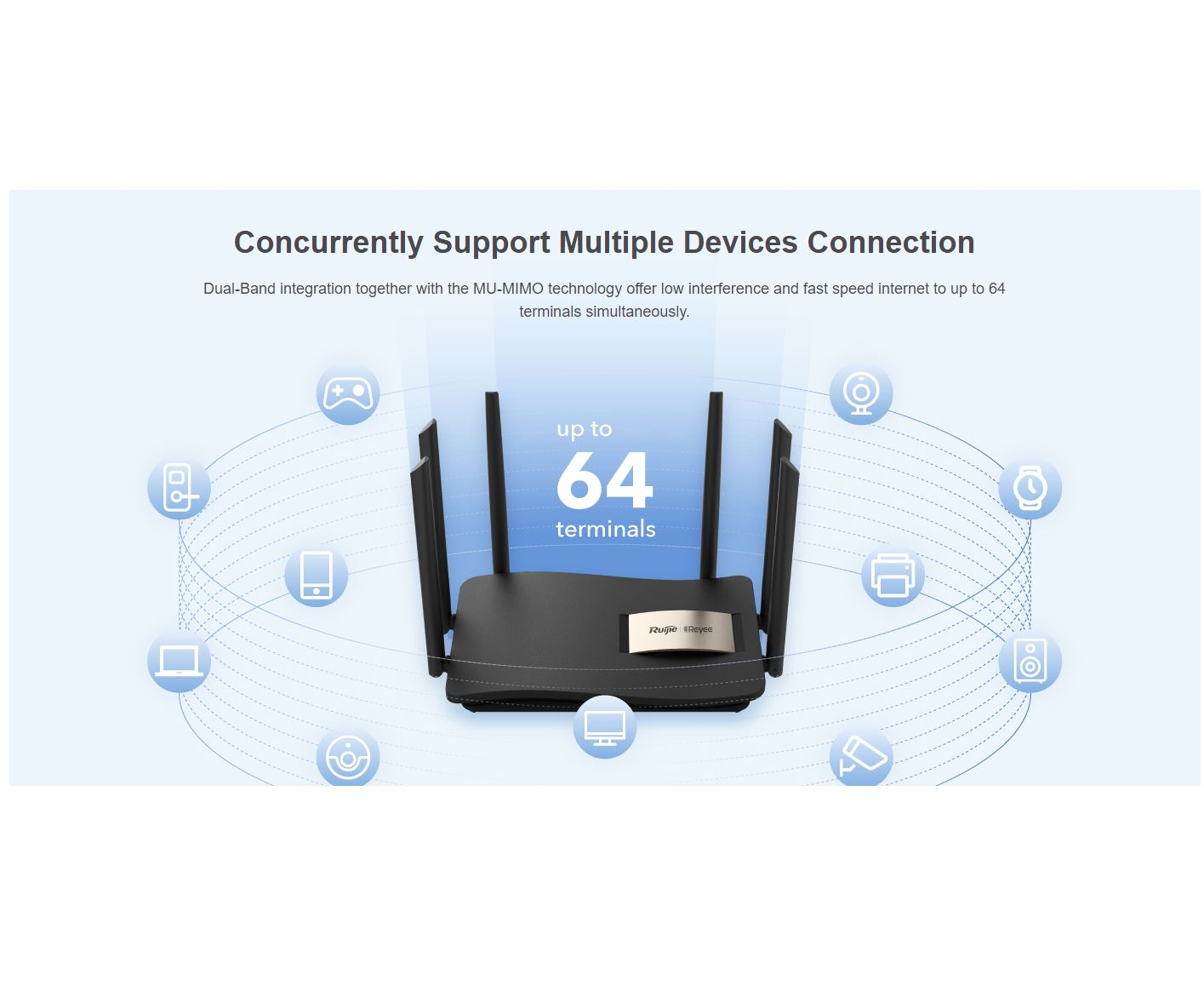 Ruijie Reyee RG-EW1200G PRO is a Gigabit dual-band wireless router designed for all types of scenarios. It comes with the next-generation Wi-Fi standard 802.11ac Wave2 boosting up to 1267Mbps, which enables seamless 4K streaming. With built-in high-power amplifiers and multiple external antennas, additionally, with MU-MIMO technology and beamforming technology, EW1200G PRO brings optimized Wi-Fi coverage throughout all types of space.
