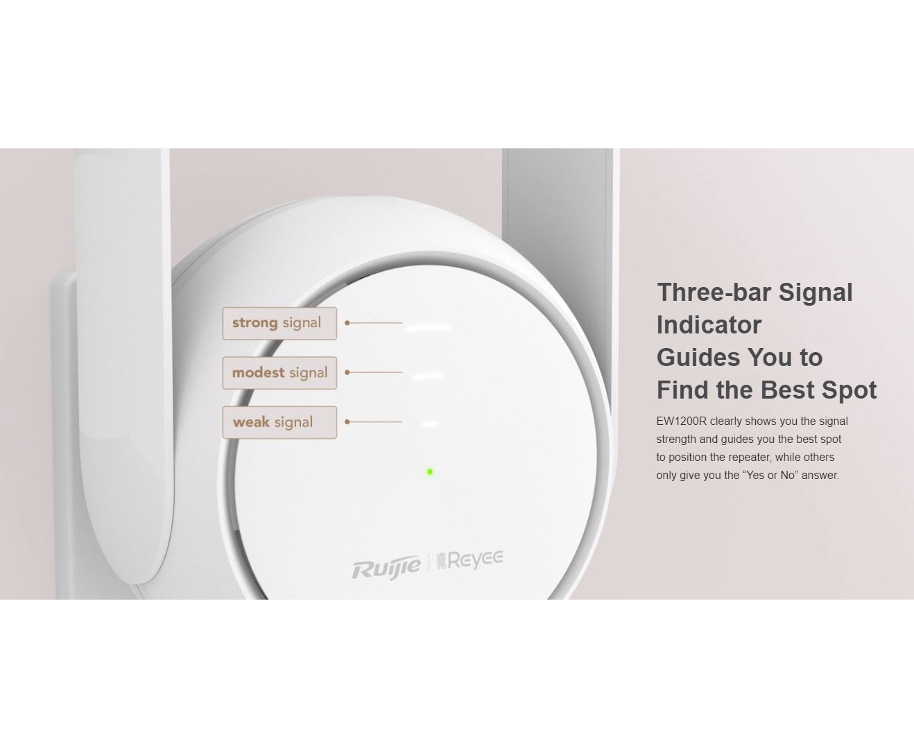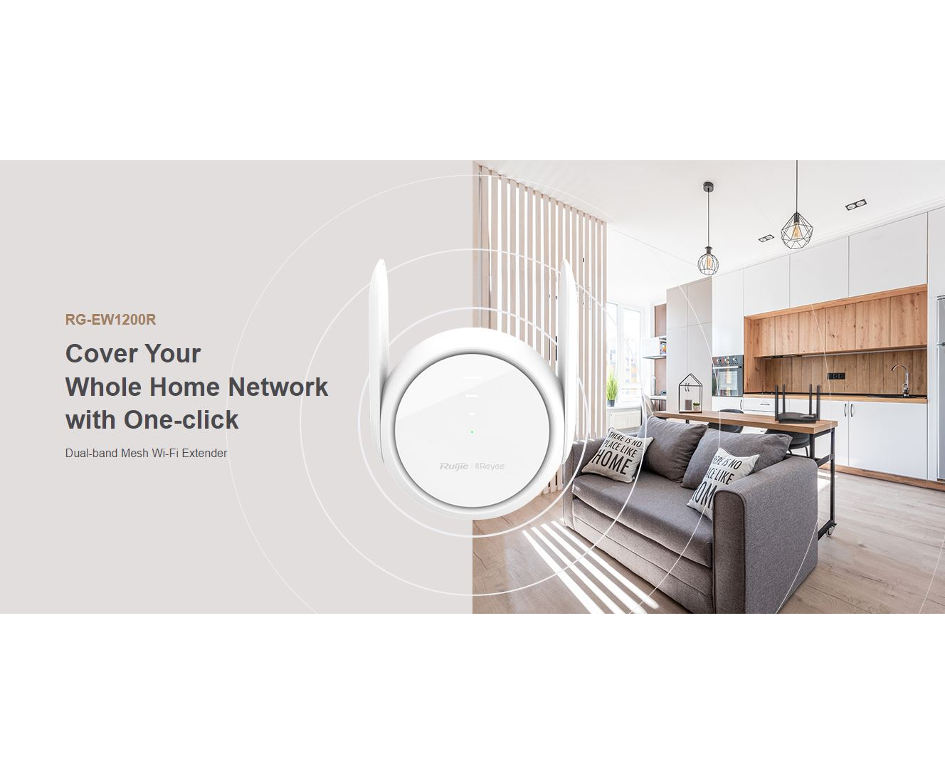The dual-band Mesh Wi-Fi extender Ruijie RG-EW1200R makes it possible to cover the entire home network in one click. Built-in signal amplifiers, uninterrupted Wi-Fi signal throughout the house. Three-bar signal indicator helps you find the best spot Reyee Mesh provides unlimited signal connection wherever you go. More wireless options.