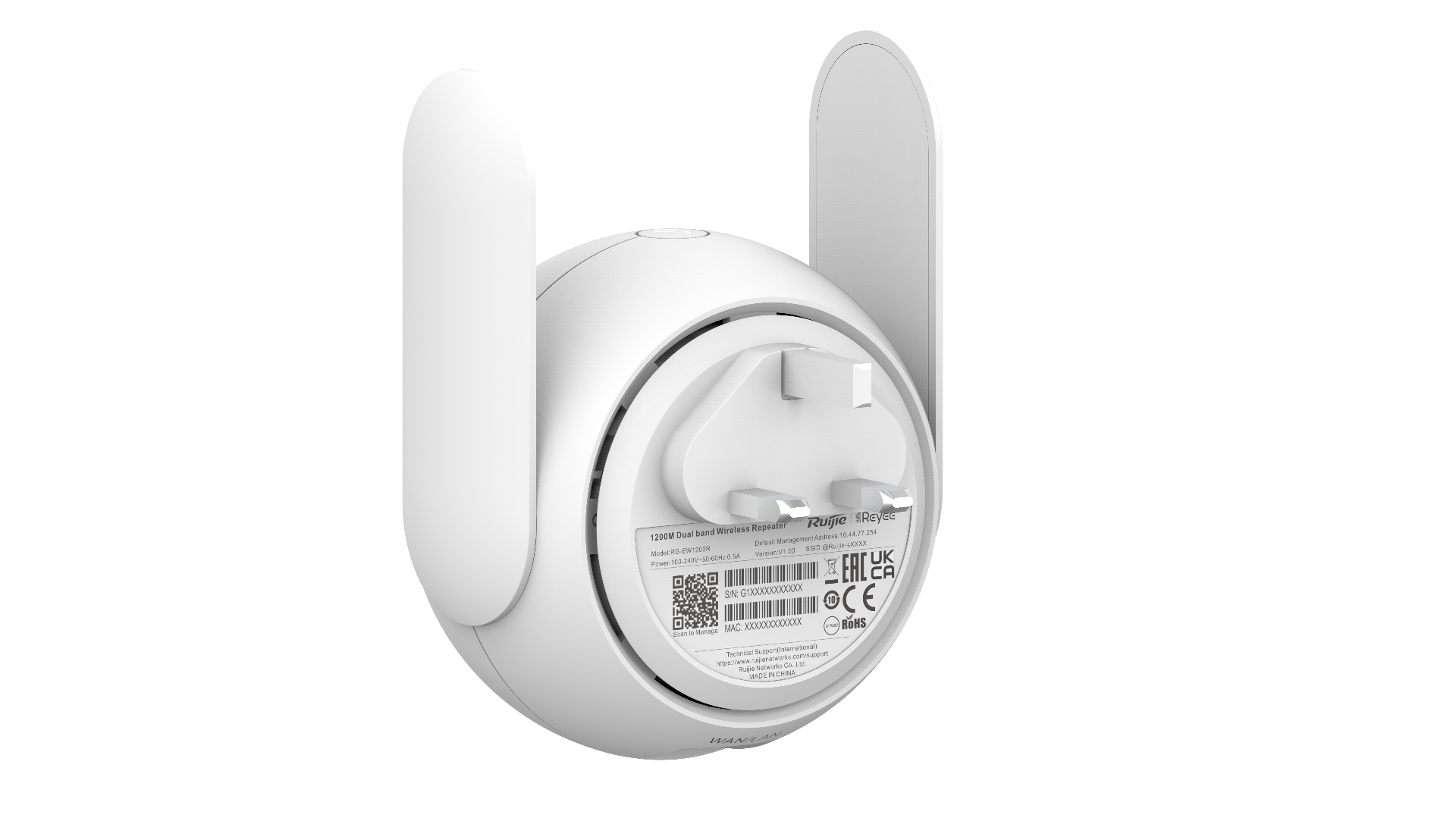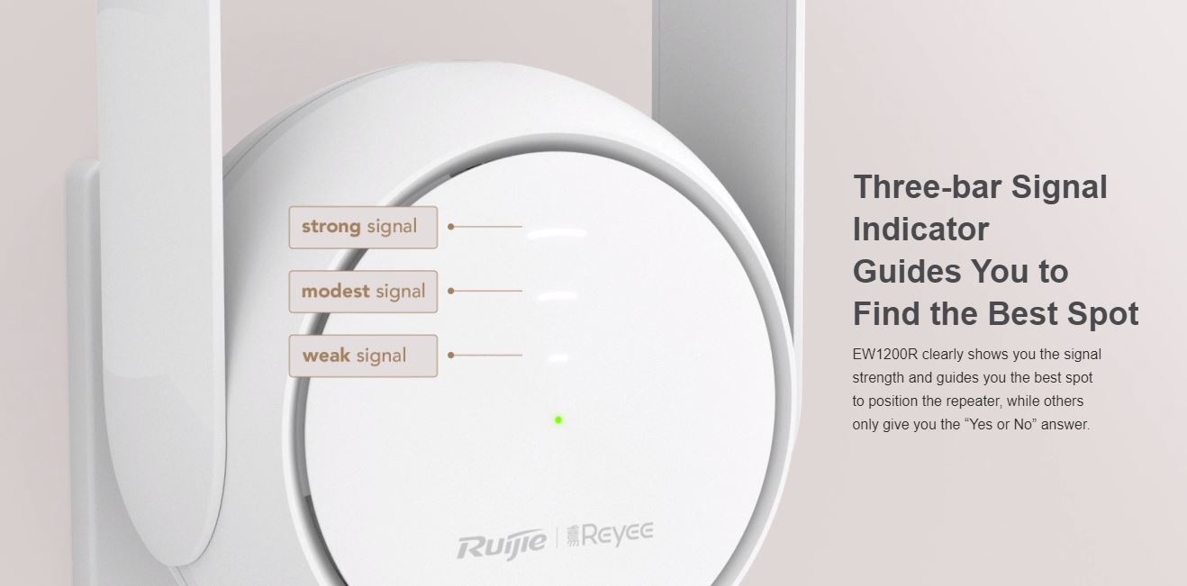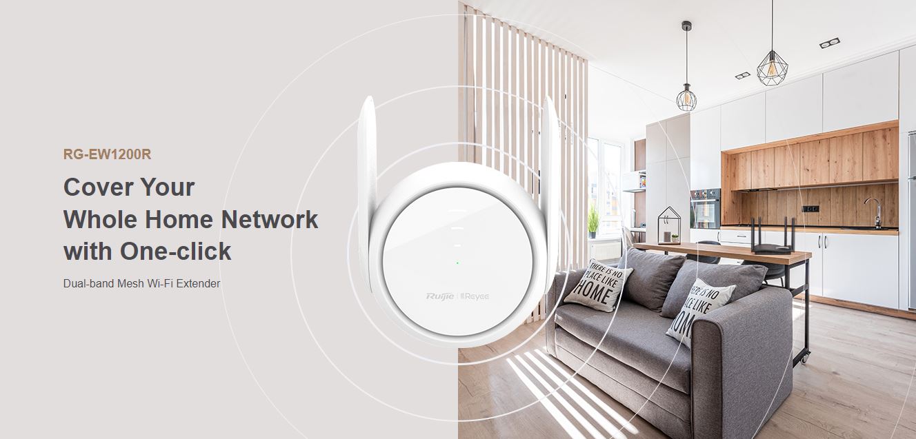 The dual-band Mesh Wi-Fi extender Ruijie RG-EW1200R makes it possible to cover the entire home network in one click. Built-in signal amplifiers, uninterrupted Wi-Fi signal throughout the house. Three-bar signal indicator helps you find the best spot Reyee Mesh provides unlimited signal connection wherever you go. More wireless options.