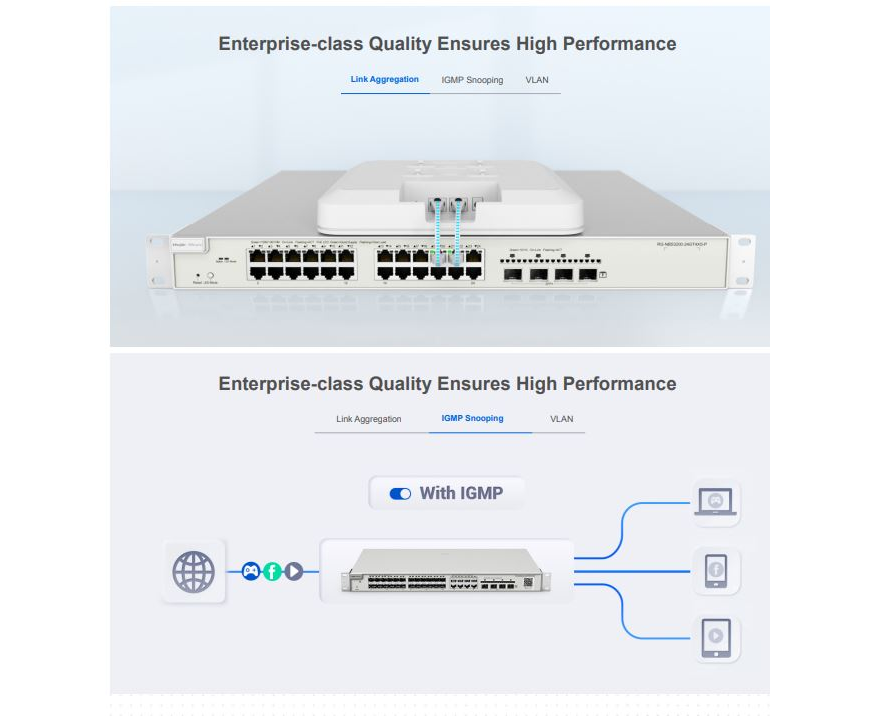 RG-NBS3200 series switches provide comprehensive end-to-end QoS as well as flexible and rich security settings for small and medium-sized networks at an extremely high price-performance ratio to meet the needs of high-speed, secure and smart enterprise networks.