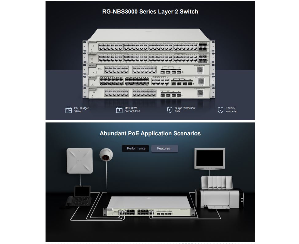 RG-NBS3200 series provides gigabit and 10-gigabit uplink ports. Every switch of this series offers 4 fixed 10G fiber ports with high-performance uplink capability.