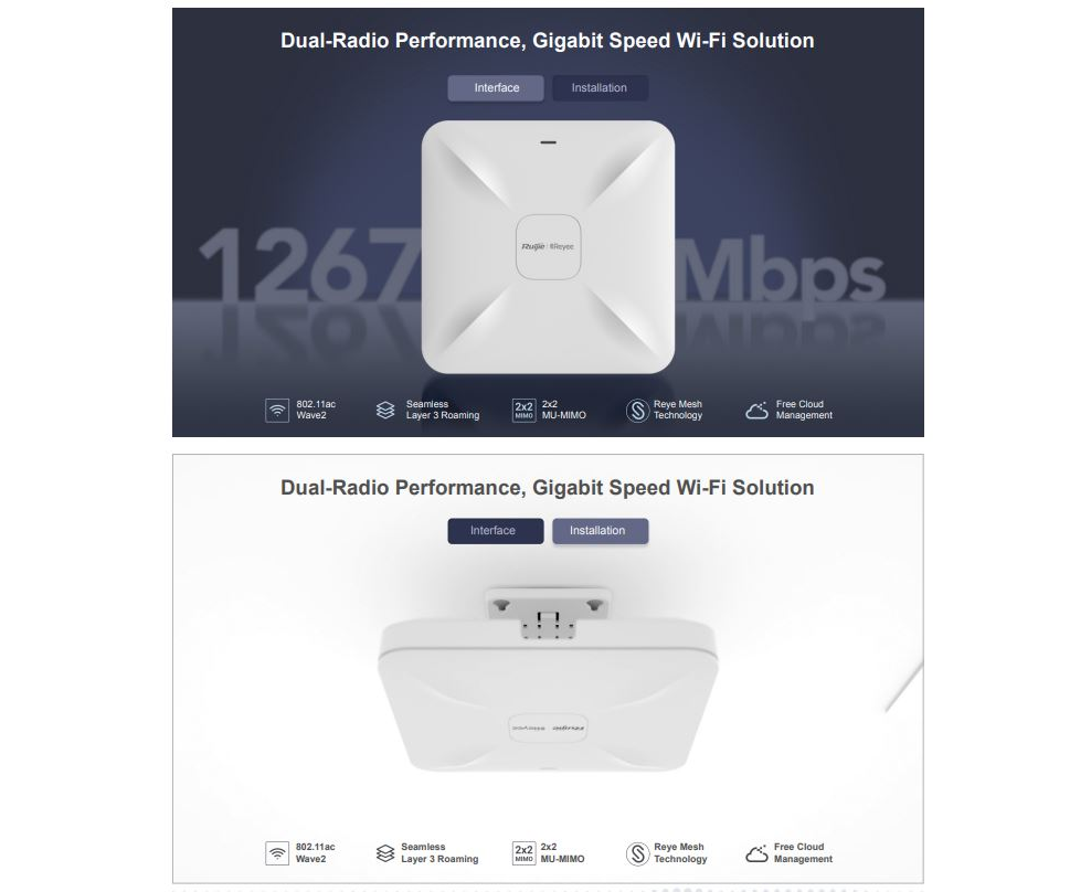 Compliant with 802.11a/b/g/n/ac Wave1/Wave2 Wi-Fi protocol, RG-RAP2200 supports MU-MIMO dual-stream technology and offers built-in omnidirectional antennas. It can operate concurrently at 2.4GHz and 5GHz, providing high-speed wireless access of 400Mbps at 2.4GHz, 867Mbps at 5GHz and up to 1267Mbps per AP.