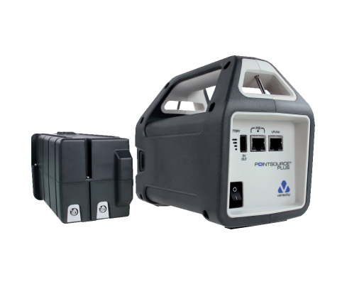 POINTSOURCE Plus has a battery life of 3 to 5 years, or 200 - 1000 cycles depending upon discharge depth and operating temperature. The battery status indicator shows the remaining charge in steps of 25%. The simple design of the system allows the removable battery to be recharged whilst POINTSOURCE Plus continues to be used with a second battery.