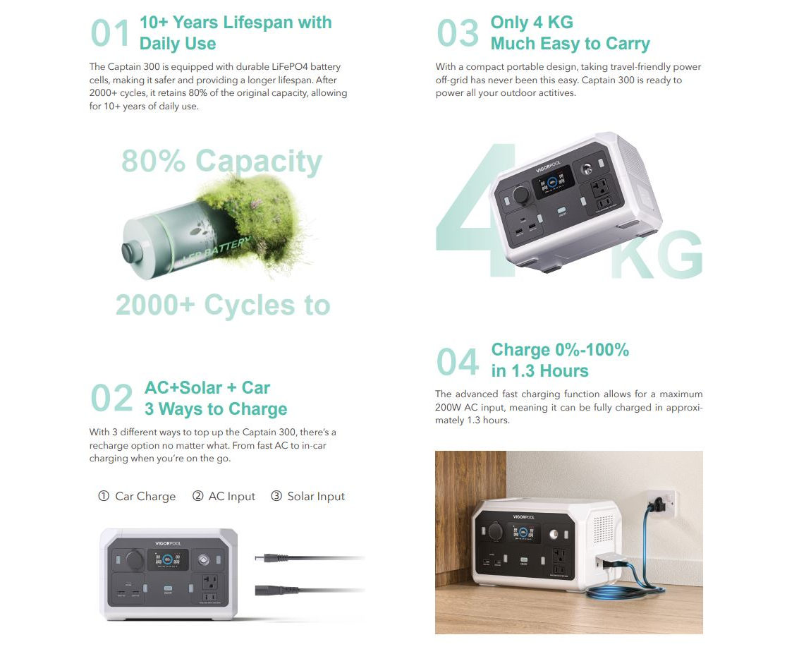 VIGORPOOL's new versatile portable power station, the Captain 300, has a capacity of 235.52Wh and an output power of 300W (surge 600W), providing convenience for your outdoor activities and internal backup solutions. The advanced fast charging function allows for a maximum 200W AC input, meaning it can be fully charged in approximately 1.3 hours.